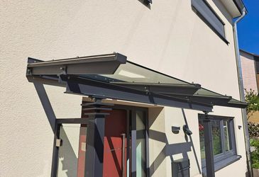 Für den Eingangsbereich dieses modernen Wohnhauses haben wir ein maßgefertigtes Vordach konzipiert und umgesetzt: eine Verbindung aus puristischer Formensprache und handwerklicher Präzision.