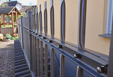 Fachgerechte Restaurierung einer geschmiedeten Tor- und Zaunanlage. Der Zaun wurde entrostet, fehlende Teile wurden nachgeschmiedet und ergänzt, anschließend verzinkt und mit Eisenglimmerfarbe beschichtet. Hiermit wurde die Lebenserwartung der Tor- und Zaunanlage um ein Vielfaches verlängert.