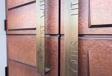 Neuanfertigung einer Kupferverkleidung für eine Portalanlage der Sankt Michel Kirche in Bernkastel. Die reliefartigen Kupferbleche wurden von Hand getrieben. Die markanten Griffstangen bestehen aus Bronze und sind mit eingefrästen Schriftzügen in Deutsch und Latein gestaltet.